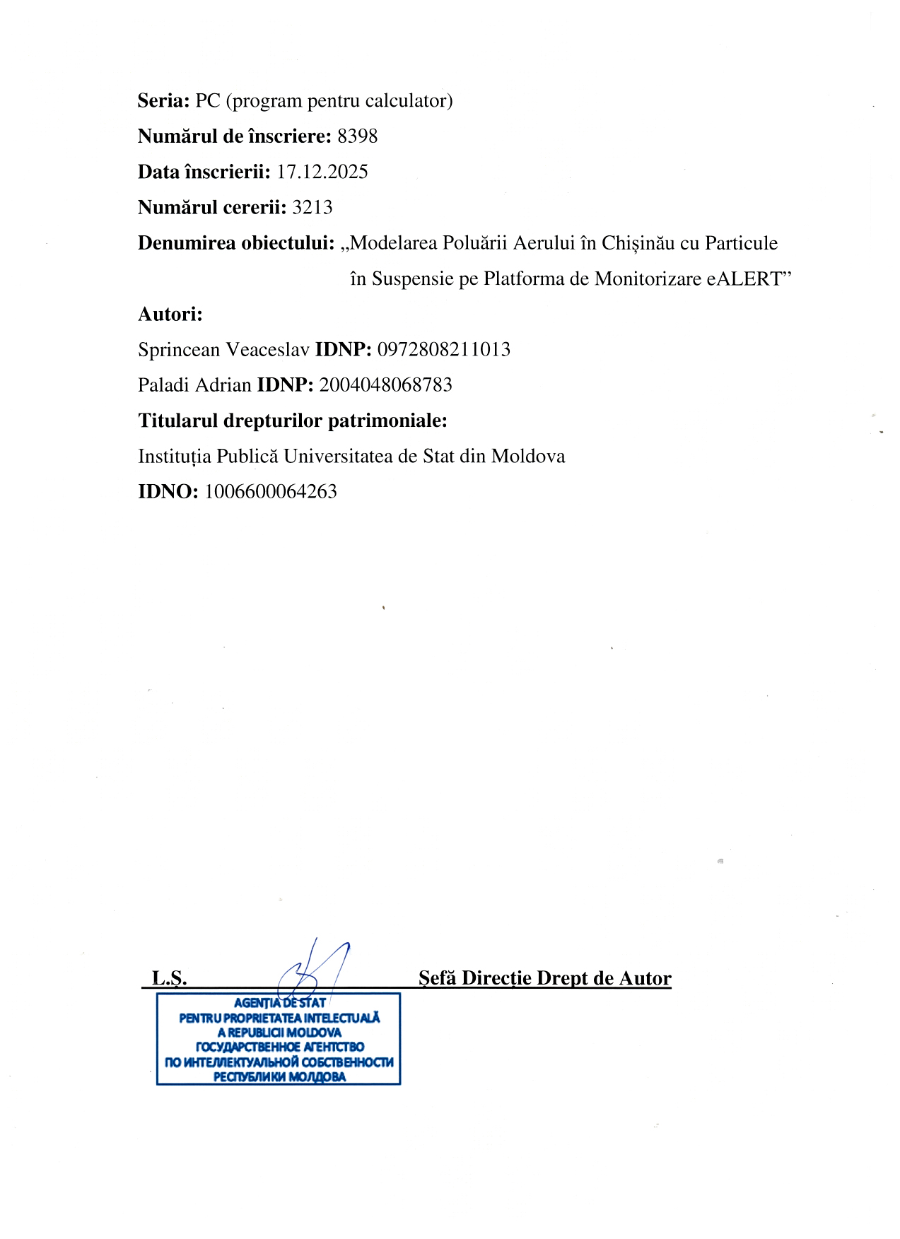 Platforma eALERT marchează o etapă importantă în dezvoltarea instrumentelor digitale dedicate protecției mediului prin înregistrarea oficială la AGEPI (Seria PC nr. 8398) a programului pentru calculator intitulat „Modelarea Poluării Aerului în Chișinău cu Particule în Suspensie pe Platforma de Monitorizare eALERT”. Autorii acestei realizări sunt cercetătorii Veaceslav Sprincean și Adrian Paladi, iar titularul drepturilor este Universitatea de Stat din Moldova.